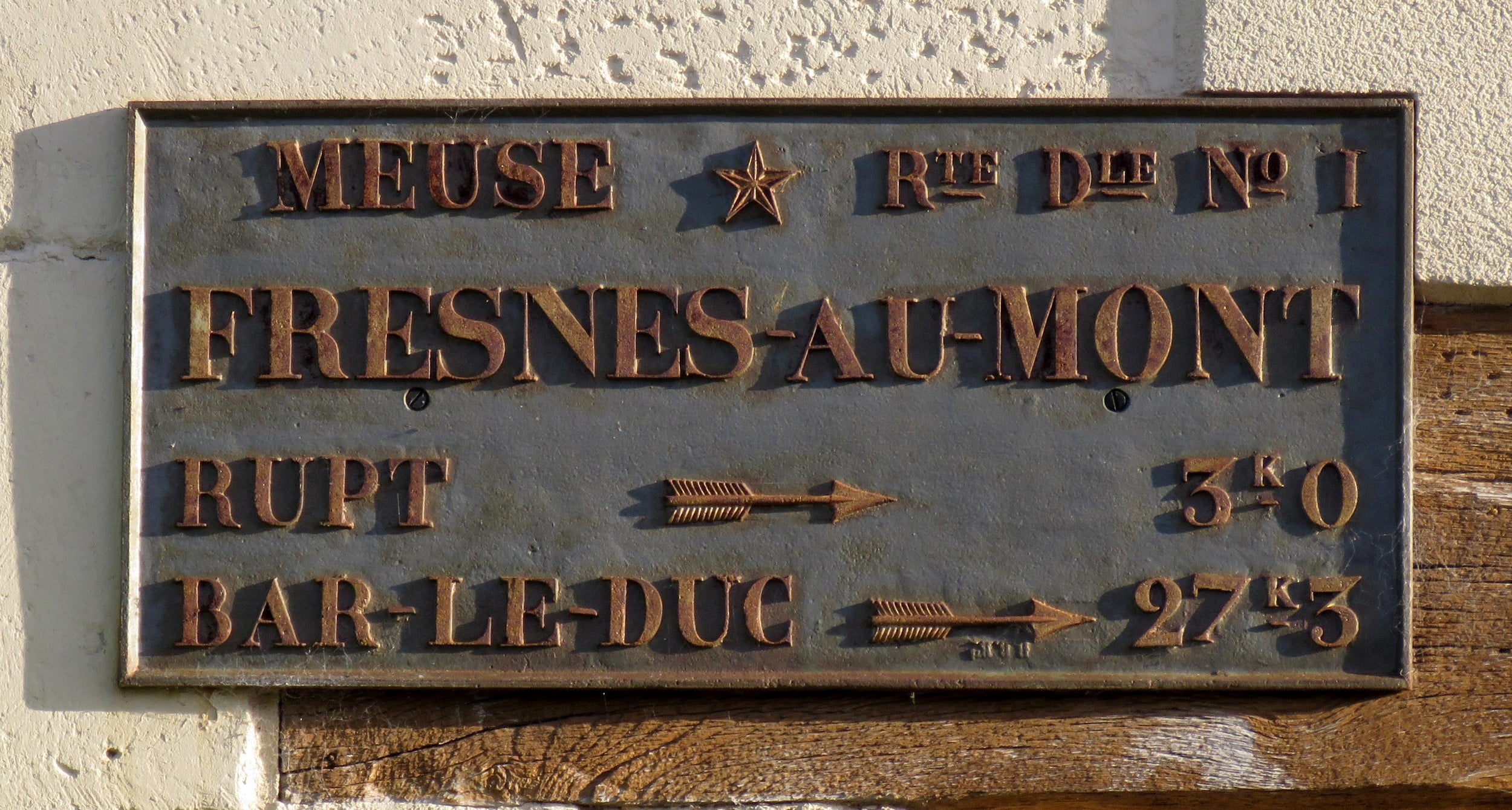 Sur la Départementale N°1 , cette plaque rechampie. Cette route allait de Bar-le-Duc à Metz, également décrite en 1850 de Bar et au-delà de Rambucourt (Rambucourt étant à la limite de la Meurthe-et-Moselle) sur unje distance de 51180 mètres. En cliquant vous verrez cette plaque joliment restaurée.