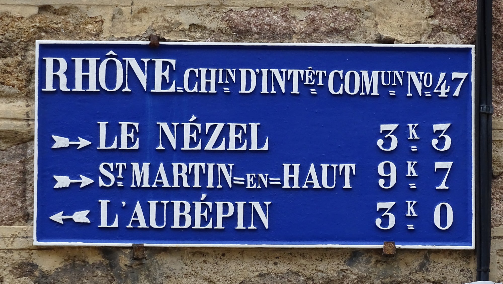 Le sud du département à Larajasse: trois plaques en l’état sur le Chemin d’Intérêt Commun N° 47 allant de St Martin à St Étienne. Sur ces trois plaques le bleu d’un précédent rechampissage apparaît encore.