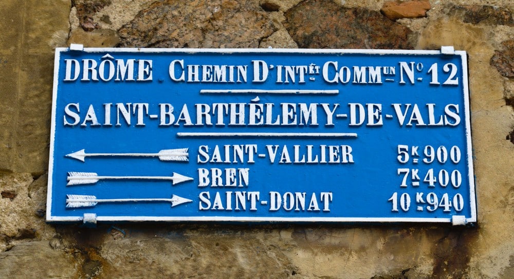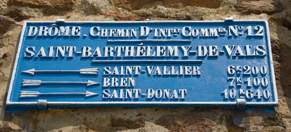 Une plaque caractéristique à ce département de la Drôme, sans flèches directionnelles mais avec les distances vers deux bourgs. Et toujours cet encart en haut pour préciser que l’on est bien dans la Drôme.