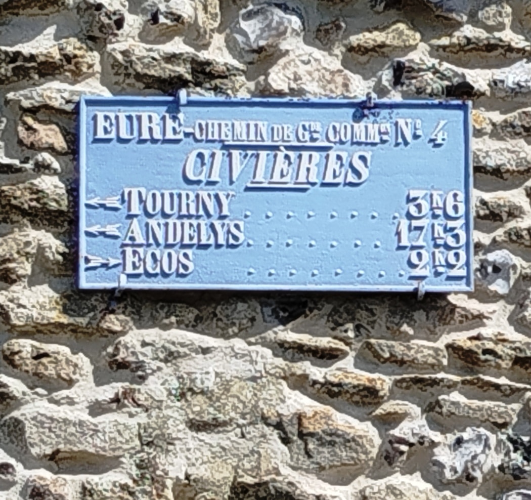 Au centre de la commune, place Louis Duguay, cette plaque initialement sur le Chemin de Grande Communication N°71 . Il allait de Garennes à Louviers avec un embranchement sur Pacy.