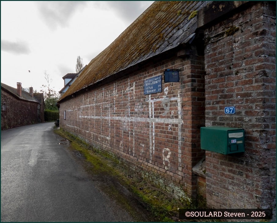 La plaque est fixée sur l’une des dernières maisons de la Grande Rue (D321) en allant sur Ménesqueville.