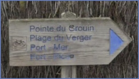 Au cœur de ce magnifique village, voici à l’intersection des rues Fourche et Grande Rue, cette plaque sur un Chemin Vicinal indiquant une seule direction: la Pointe du Puits. (à noter que l’accent semble bien être en trop).