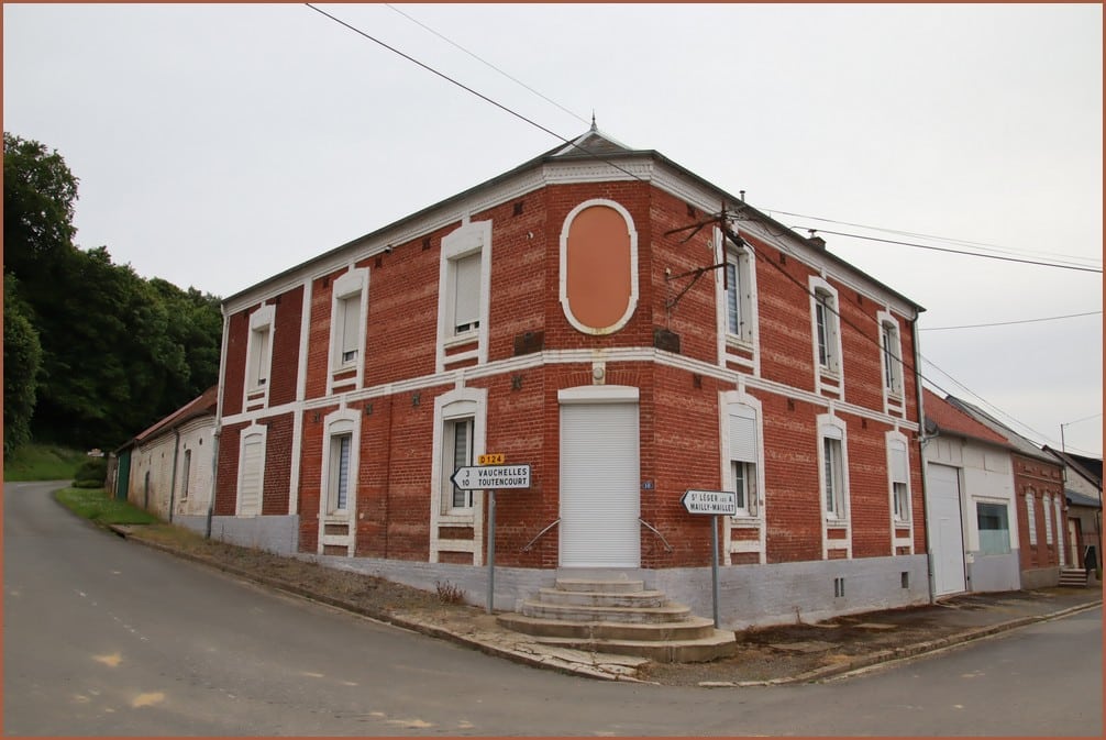 Toujours sur l’ancien Chemin de Grande Communication N°176, juste avant le virage à angle droit rue de Bertrancourt (D176), intersection avec la rue du Milieu, cette plaque peut être selon la saison enfouie dans la végétation. Cette voie de Thièvre à Mailly avait une longueur de 11888 mètres et fut classée en 1877.