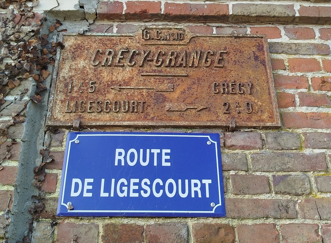 Marcheville et Crécy-en-Ponthieu fusionnent en 1973. Ces deux premières plaques sur le territoire de l’ancienne commune de Marcheville laquelle se situe au sud du bourg de Crécy. Traversée par l’actuelle D12, anciennement Chemin de Grande Communication N°10, nous trouvons en angle deux plaques : rue du Maréchal Leclerc (D12) intersection avec la Route de Froyelle(s) (C201). Le CGC N°10 fut classé en 1845 / 1846 d’Airaines à Douriez puis reclassé sous le même numéro en 1877.