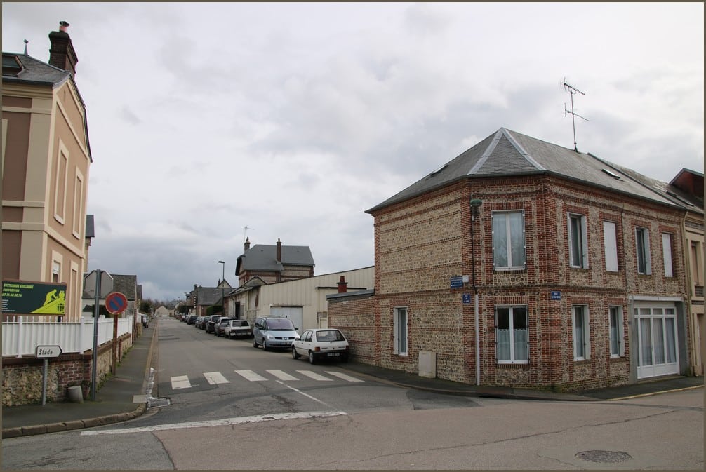 Rue du Maréchal Foch (D32), cette plaque devait se situer à l’intersection avec la rue Victor Petitpas, mais bien sur le Chemin de Grande Communication N°32 allant du Havre à Étratat. D’une grande précision, au mètre près, distances calculées jusqu’aux mairies.
