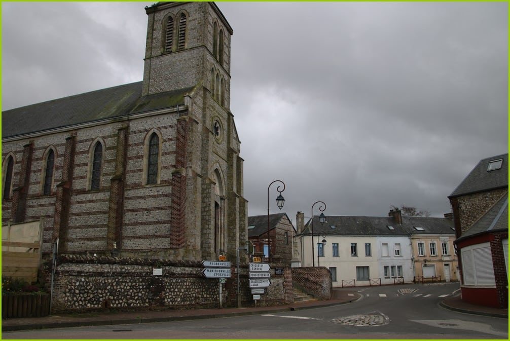 En contrebas de l’église, rue de la Liberté (D79), à son intersection avec la rue des Hirondelles (D11). L’abréviation Mt Rti indiqué après Fongueusemare indique le lieu-dit le Mont Rôti ou Rôty.