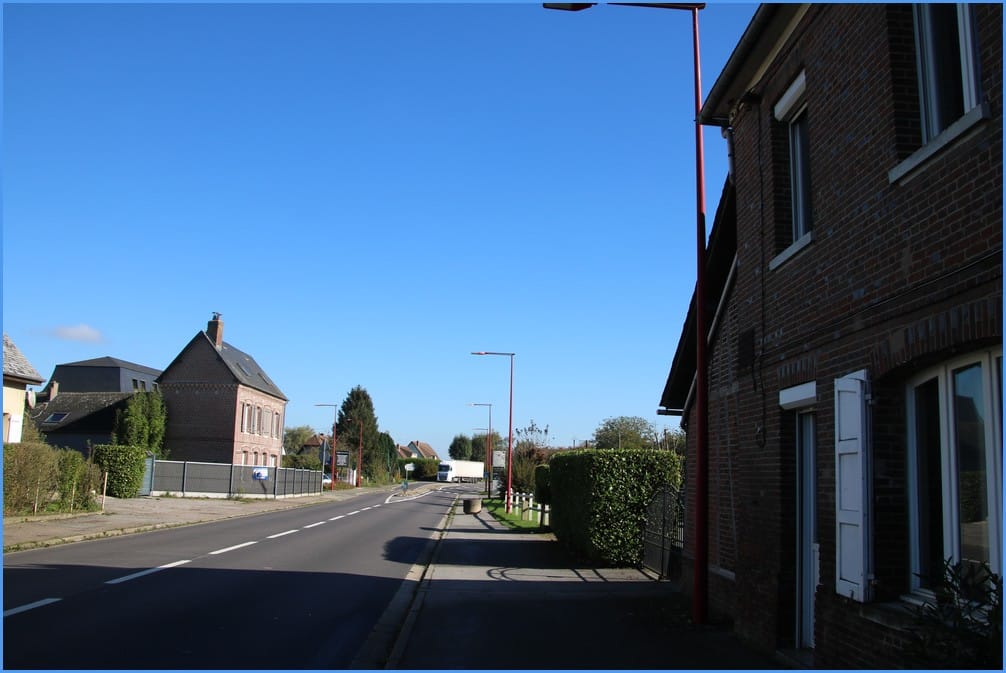 Rue Gaston Dehais (D139) X rue Capitaine Gosselin (D32), en face de l’église et du Monument aux Morts. En examinant ces plaques on constate qu’il y avait des éléments de fixation démontés, on peut supposer qu’elles étaient sur un mât lequel fut démonté. Ci-dessous une photographie d’époque ou cette hypothèses est corroborée.