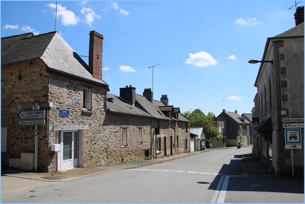 La rue principale s’appelle rue de Normandie (bien que nous ne soyons qu’a quelques centaines de mètres de la Bretagne puisque l’Ile et Vilaine est frontalière avec cette commune mayennaise). La Départementale 106 était à l’époque de cette plaque le Chemin de Grande Communication N°6. Cette voie allait du Pertre à la Croixille avec un embranchement de St Pierre-la-Cour sur Vitré. On est pas certain que cette plaque soit à son emplacement originel.