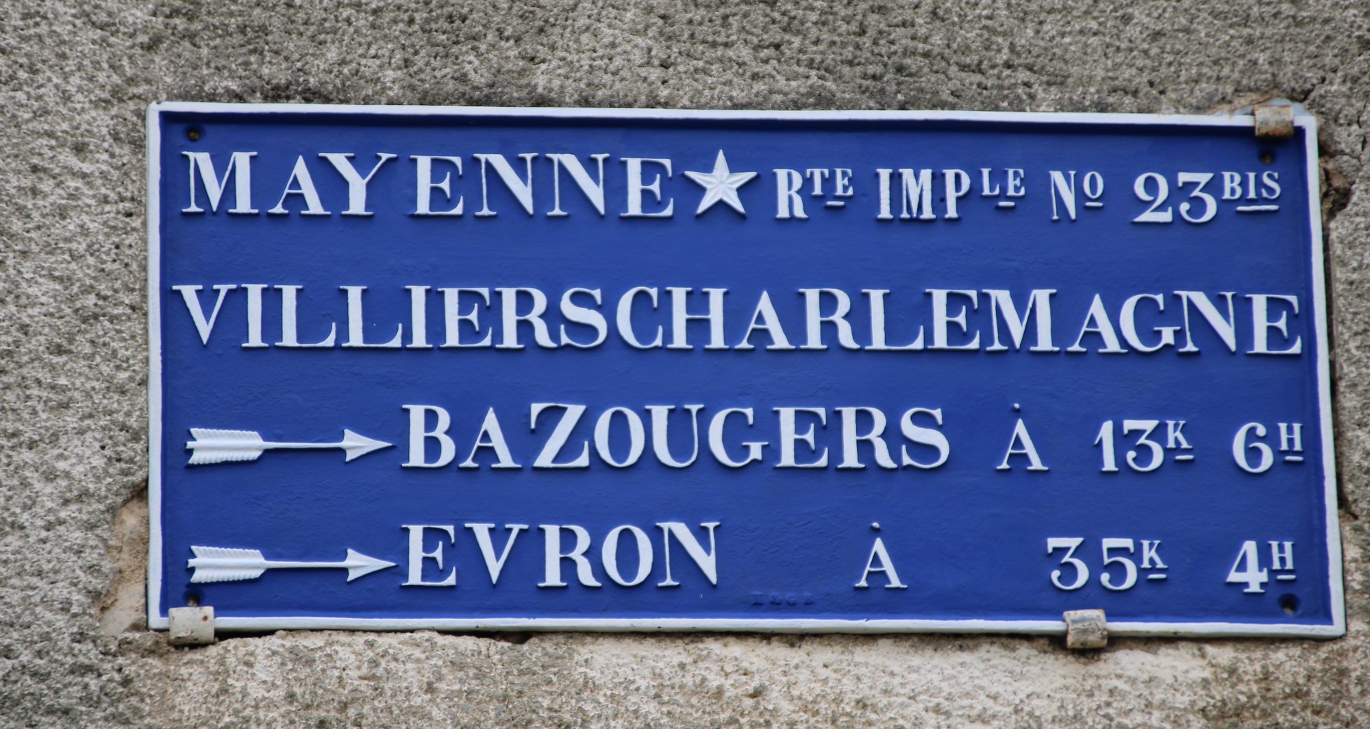 Cette plaque était dans un carrefour en campagne à l’Espérance, près de Longuefuye, en Mayenne. Elle était dans le jardin de Jean Daniel Patureau à Longuefuye.