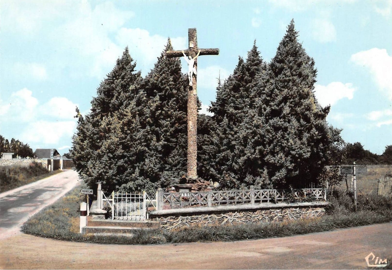 -Sur cette carte postale des années 1970 le mât à la droite du calvaire. Il fut démonté pendant plusieurs années-