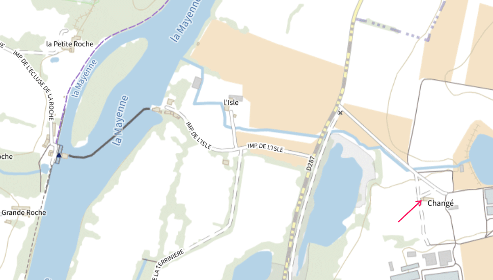 Sur cette carte l’ancienne maison éclusière est pointée par une flèche rouge : nous voyons qu’elle est assez éloignée de la Mayenne (environ 1km) mais près d’une dérivation. Cette dernière, mise en place en 1860, n’apparaît que sur certaines cartes aujourd’hui. Disons le carrément, elle n’existe plus.