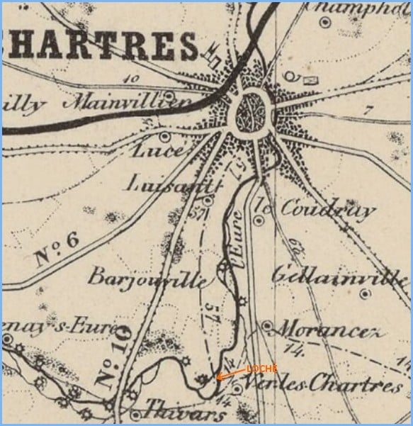 Il n’y a plus aucune plaque directionnelle en fonte à Chartres. Pourtant nous aurions pu en trouver à chaque départ de voie, Nationales ou Impériales, de Grande Communication ou d’Intérêt Commun. Et c’est justement sur cette dernière classification qu’une des plaques du XIXème fut sauvée à titre privé, elle se situait au départ du Chemin d’Intérêt Commun N°57 . Il partait de Chartres pour rejoindre Loché sur une distance de 6km8 (1869). Nous lisons sur la plaque (Ver), Loché étant un hameau de cette commune (voir carte ci-dessous).