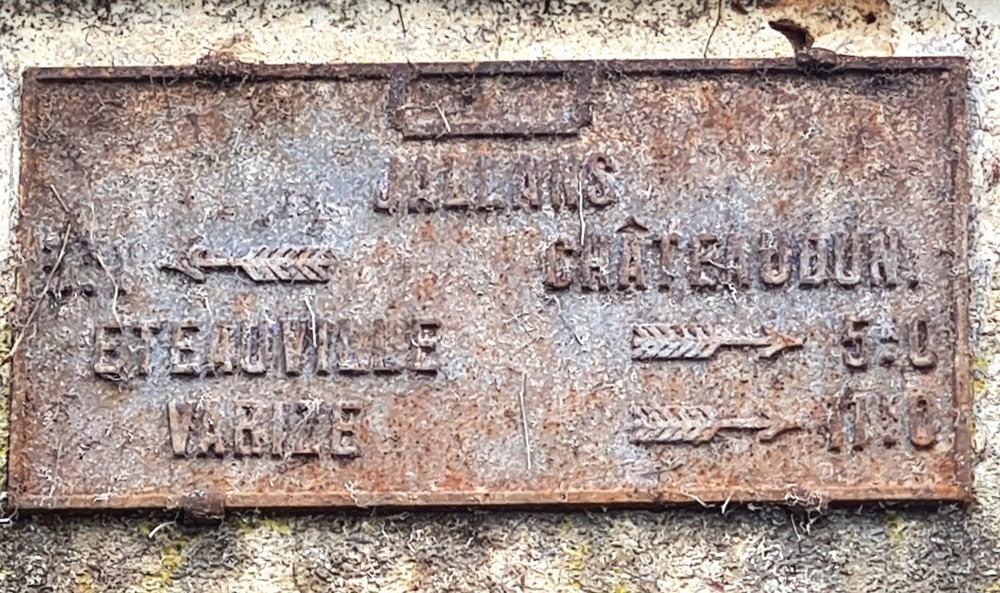 Cette plaque fut ces dernières années enfouie sous la végétation recouvrant la façade de la maison. Rue de la République (D7927) à l’angle de la rue des Bordes, à l’époque nous étions sur le Chemin de Grande Communication N°48 allant de Montmirail à Toury par Châteaudun . Une déviation fut mise en place à Jallans en 2006.