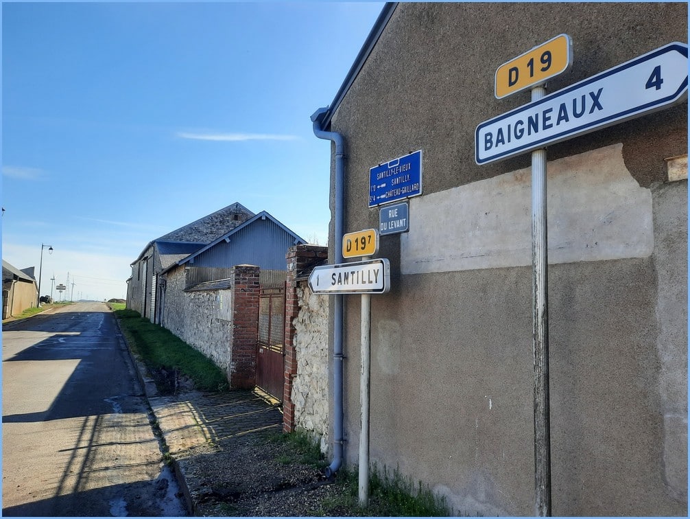 De Santilly, commune frontalière avec le Loiret, pour rejoindre le hameau de Santilly-le-Vieux, on empruntait le Chemin de Grande Communication N°197 allant de Santilly à Château-Gaillard. . En arrivant sur le Chemin de Grande Communication N°19 (anciennement CGC N°41), intersection rue de Patay (D19) X rue du Levant (D197), cette plaque rechampie récemment si on se réfère à sa couleur lumineuse.