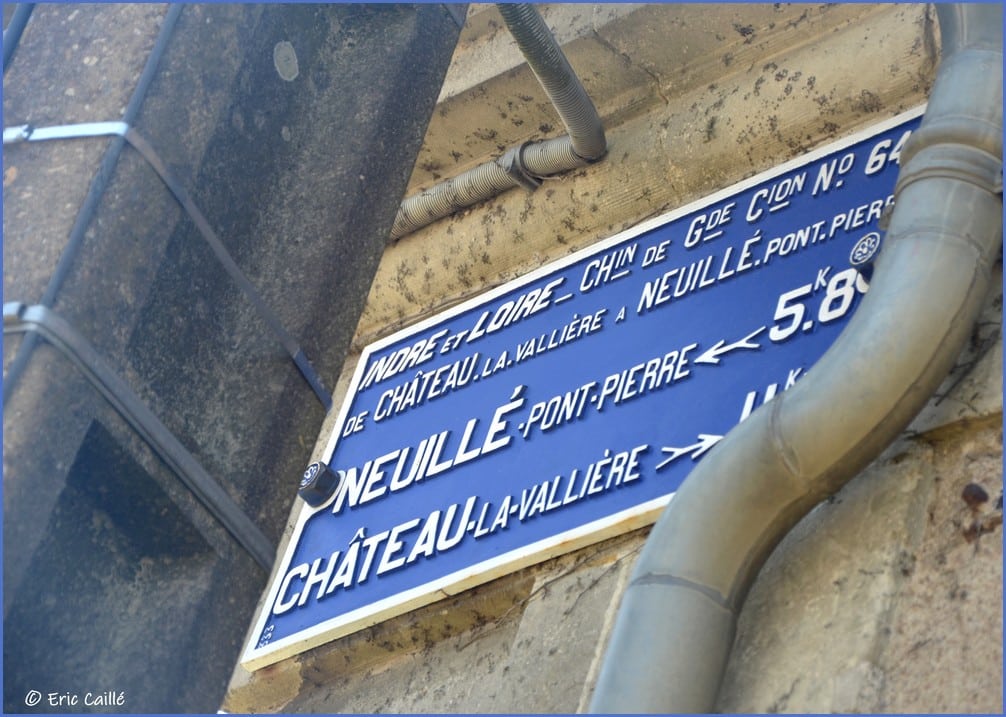 Ici nous sommes sur la D766, il s’agit de l’ancienne Route Nationale portant le même numéro, déclassée en 1972, axe Blois – Angers. A l’intersection avec la D6, (hameau du Petit Souper) qui n’était autre que le Chemin de Grande Communication N°6, il y a deux plaques. La seconde, aujourd’hui sur la D766, était à l’époque sur la voie de Grande Communication N°64, elle allait de Château-la-Vallière à Neuillé-Pont-Pierre. Ce chemin fut nationalisé de 1933 à 1973, en effet il intégra la Route Nationale 766 de Blois à Angers par Château-la-Vallière.