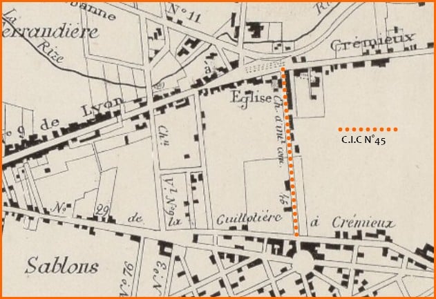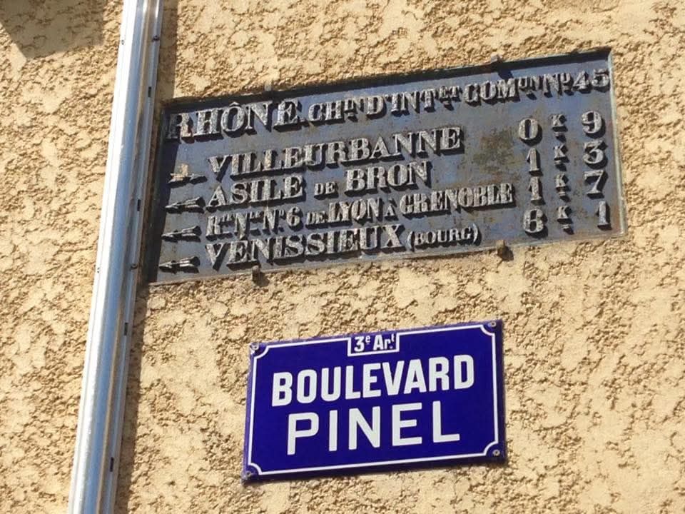 Sur le plan de 1890 le Chemin d’Intérêt Commun N°45 n’apparait pas. Mais sur la carte dont voici un extrait ci-dessous il est tracé, allant de la Départementale N°9 au Chemin de Grande Communication N°29 (actuel Cours Richard Vuitton). Sur la nomenclature de 1897 cette voie est décrit sur une distance de 7 kms allant de Villeurbanne à Vénissieux. La plaque, Boulevard Pinel,  est à l’intersection avec le Cours Richard Vuitton, ancien CGC N°29.