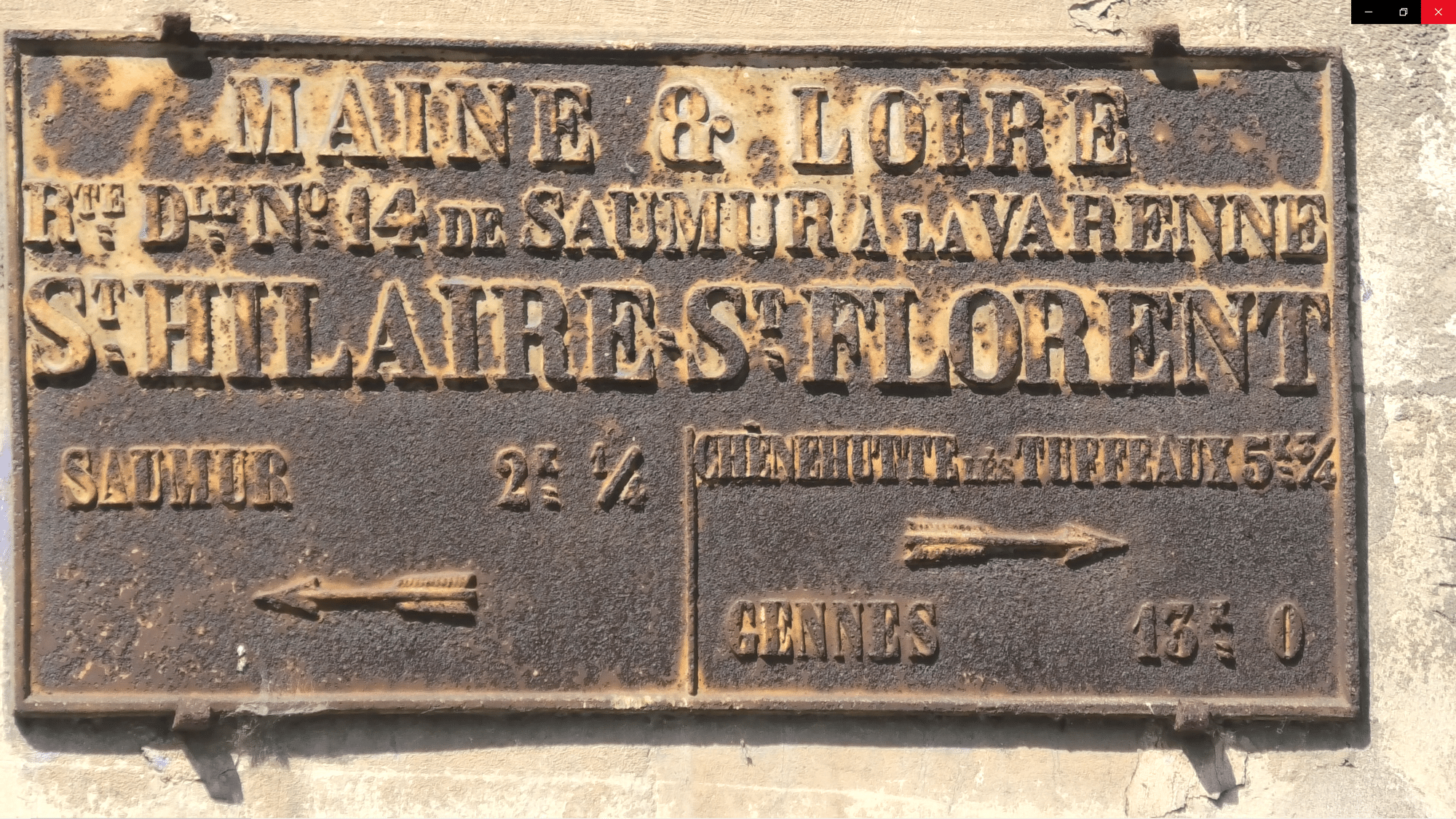 Une plaque rue René Gasnier (D751) en allant sur Chalonnes juste après l’intersection avec la rue Haute du Martreau. Nous étions alors sur la Départementale N°14 de Saumur à La Varenne. A noter comme sur la plaque précédente les fractions utilisées pour les distances.