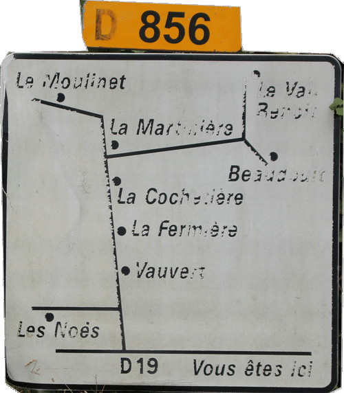Dans le village, de part et d’autre de l’église, on trouve une plaque de cocher, puis un mât. Voici la plaque, à l’intersection de la D254 et un chemin vicinal, qui rejoint plus loin la D249. (cercle rouge sur la carte).
