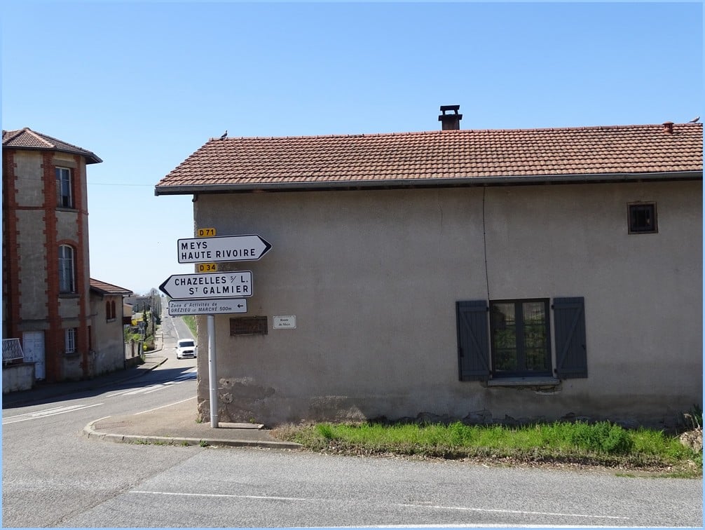 Le Chemin d’Intérêt Commun N°59 allait de St Symphorien (sur-Coise) à Meys, il desservait donc Grézieu-le-Marché. Intersection avec l’actuelle D34 -localement  rue de La Bascule- cette plaque est au début de la Route de Mey.