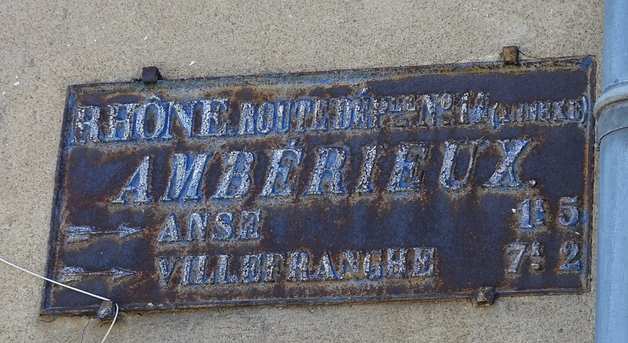 Une vieille plaque toujours en place à Ambérieux. Elle se situait sur une annexe de la Route Départementale N°14, cette route qui allait de l’Arbresle à Neuville en ce qui concerne la voie principale. Rue de la Mairie, cette rue est aujourd’hui occultée puisqu’elle se termine par un chemin de terre. Mais à l’époque on franchissait grâce à un passage à niveau la voie ferrée (c’était la ligne Paris – Lyon), il fut supprimé en 1935. Quand à la Départementale 14 elle devînt Chemin de Grande Communication (N°14bis) en 1887. Cette plaque a donc survécu à tous ces changements.