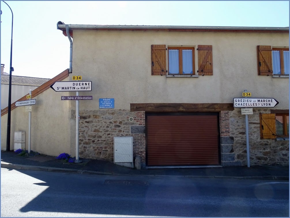 Route des Monts du Lyonnais, juste à côté de l’entrée de la Cour du Soleil, nous sommes sur le parcours initial de la D2, laquelle fait suite au reclassement du Chemin de Grande Communication N°2 de Givors à Chazelles. C’est bien sur cette voie que nous trouvions la plaque directionnelle indiquant Riverie et St Symphorien-sur-Coise.