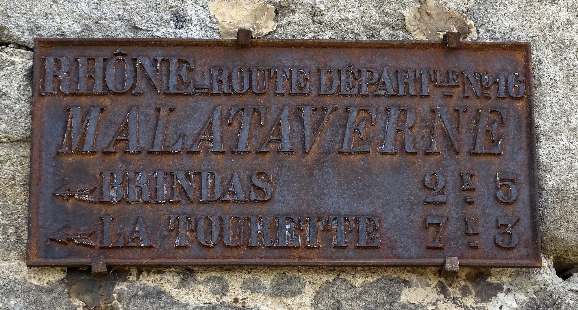 La Route Départementale N°16 allait de Craponne à St Symphorien jusqu’en 1887, année au cour de laquelle elle fut déclassée et devînt le Chemin de Grande Communication N°16bis. Malataverne, à l’est de Messimy, est un  hameau. La plaque, Route du Mont des Lyonnais (D311), intersection avec la D75 localement Avenue des Alpes / Chemin du Pivolle. Cette plaque de la fonderie Bouilliant peut dater de 1878, année durant laquelle le Conseil Général du Rhône commanda des plaques directionnelles à cette fonderie.