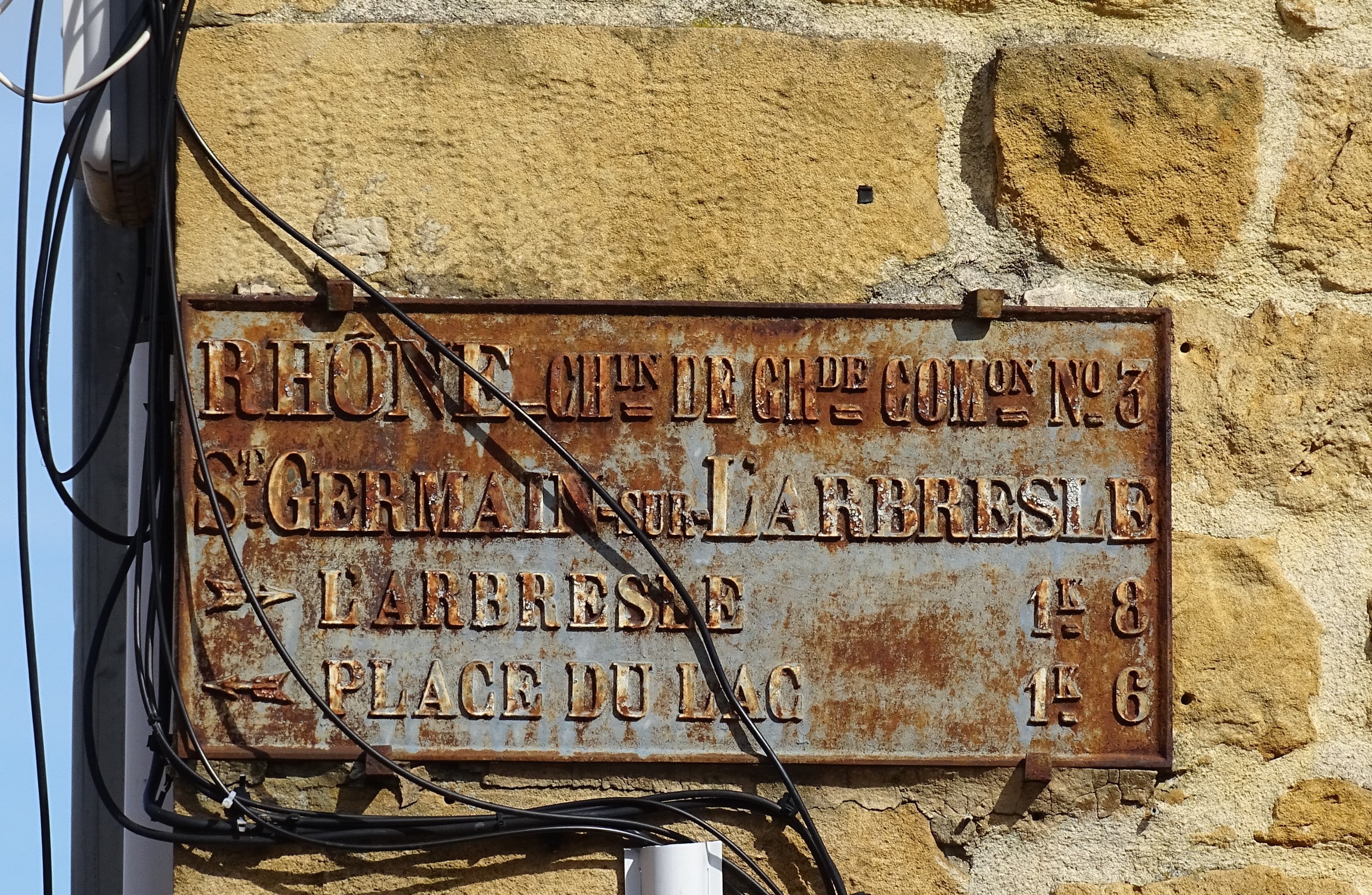 Rue Aymé Châlus (D76) nous découvrons cette plaque en arrivant par la Montée du Cardinal Fesch sur le bâti aux pierres ocres caractéristiques de la région. Il s’agissait à l’époque du Chemin d’Intérêt Commun N°26 de l’Arbresle à Villefranche. Le chemin d’Intérêt Commun N°30 flèché sur la plaque allait d’Anse à Theizé sur une distance de 6kms, aujourd’hui la D39.