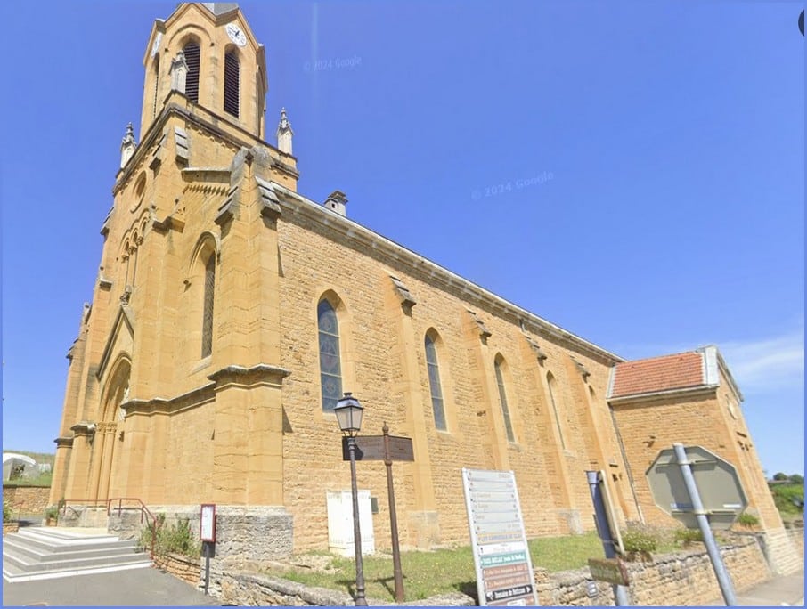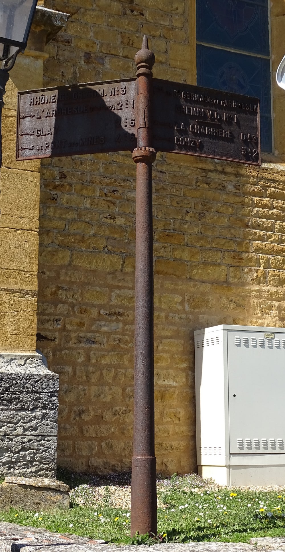 Un mât bi-plaques sur le bas-côté extérieur de l’église St Germain, ancienne commune de St Germain-sur-l’Arbresle (nous lisons sur les cartes actuelles « église St Germain-Nuelles » alors que l’ancienne commune de Nuelles possède sa propre église, St Joseph). Pour les routes que ce mât renseigne, il s’agit du Chemin de Grande Communication  N°3 et du Chemin Vicinal N°1. Est donc également flèchée la Nationale 7 sur la commune d’Arbresle, mais aussi le Pont des Mines sur l’Azergues.
