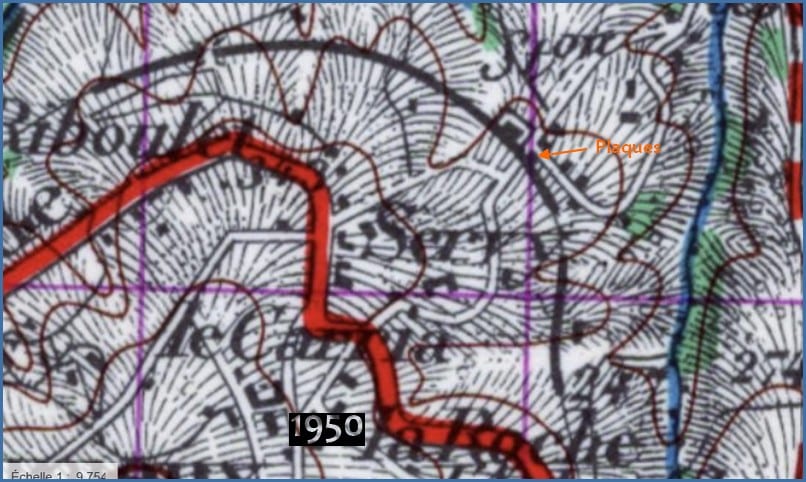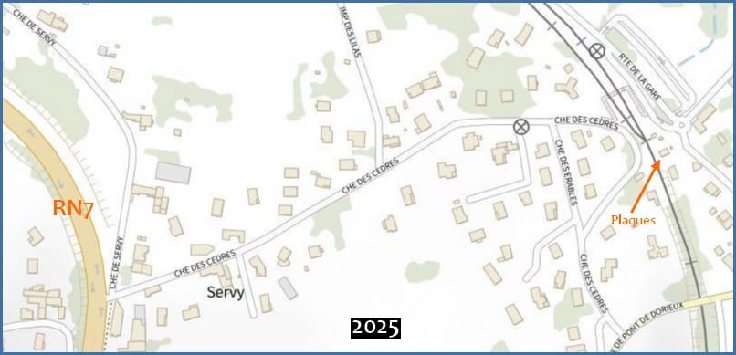 Ces deux plaques en angle sont fixées sur l’ancienne maison du garde barrière prés de la gare de Fleurieux-sur-l’Arbresle (elle s’appelait la gare de Fleurieux-Lozanne). La première plaque était sur le Chemin Vicinal Ordinaire N°1. Elle flèche notamment la Nationale 7 à 0km800. Ci-dessous deux cartes, l’une moderne sans passage à niveau, l’autre de 1950 avec passage à niveau.