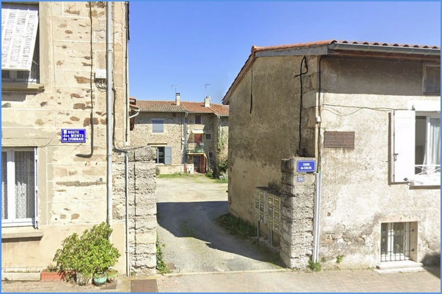 Lieu-dit La Croisée, rue de Cours (D308) intersection avec la rue de Lagresle (D58), deux plaques en angle sur un commerce. Une seule est photographiée. Elle se situait sur la Route Départementale N°5 allant de Frans à Roanne dans la Loire, nous ne sommes d’ailleirs qu’à 2kms2 de la frontière avec ce département limitrophe.